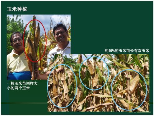 Oben: 2 Kolben mit gleicher Größe pro Stiel; ca. 40% Maispflanzen des Testanbaugebietes tragen doppelte Maisfrüchte.