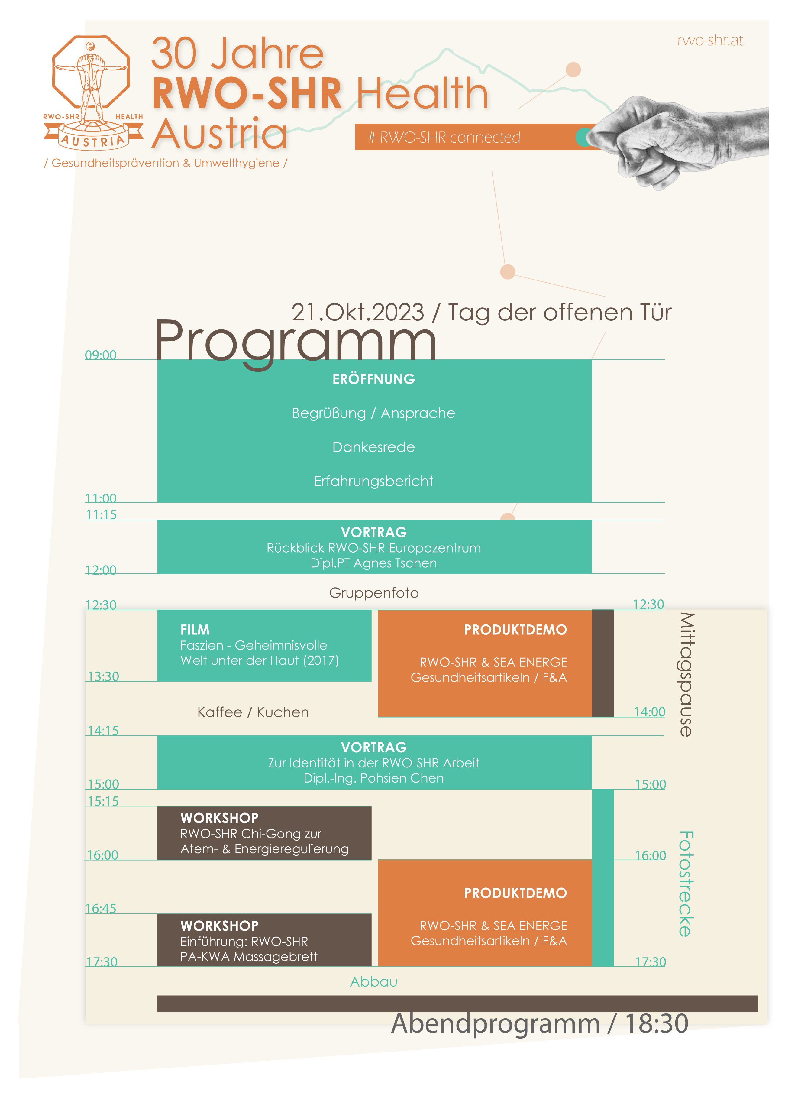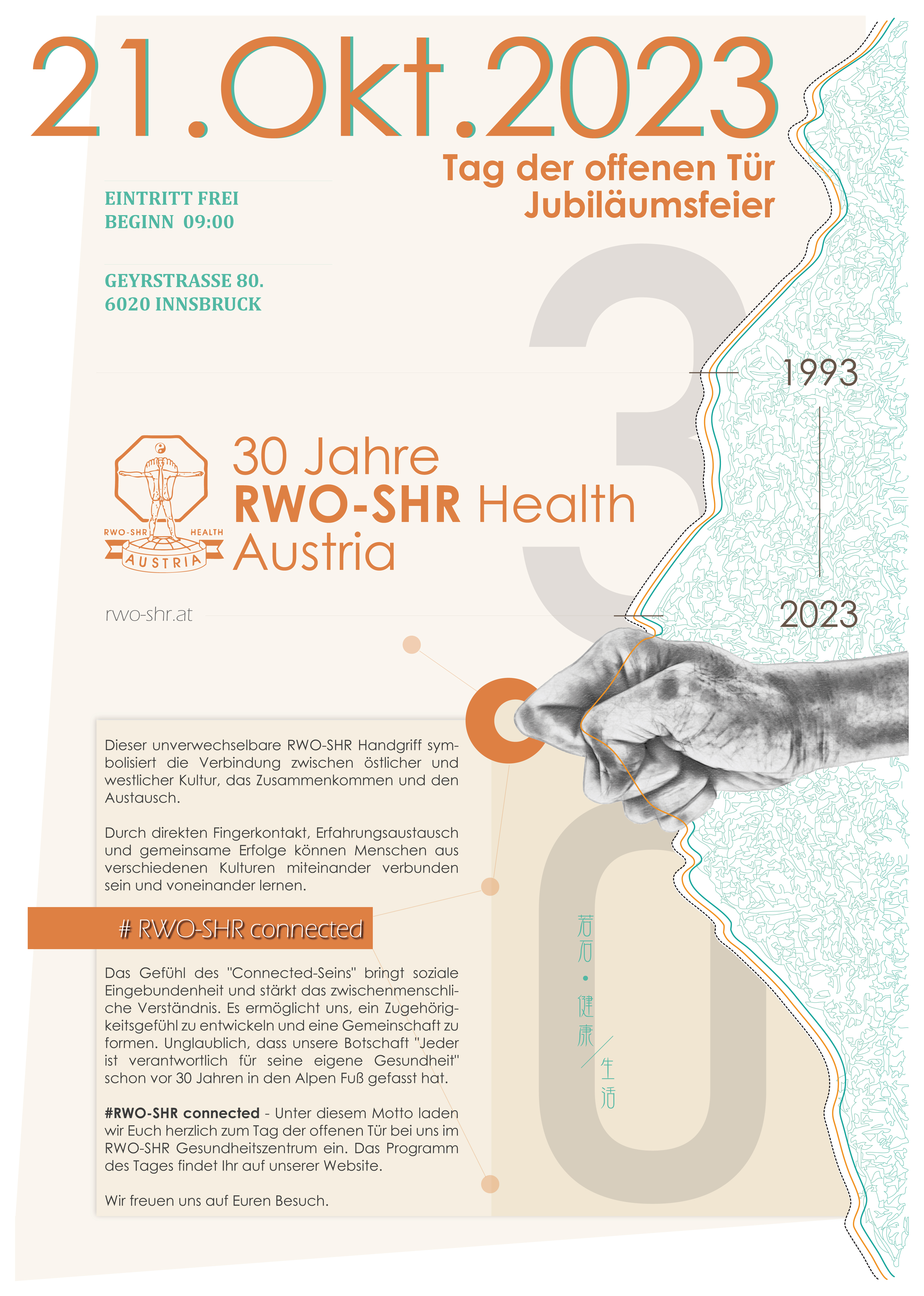 Am 21. Oktober 2023 haben wir unser 30-jähriges RWO-SHR Jubiläum mit einem Tag der offenen Tür gefeiert. Unter dem Motto "RWO-SHR Connected" haben wir gemeinsam mit vielen WegbegleiterInnen aus Nah und Fern auf die erfolgreichen 30 Jahre RWO-SHR Arbeit in Innsbruck zurückgeblickt. Neben spannenden Erzählungen von RWO-SHR Freunden der ersten Stunde, die gemeinsam mit Agnes wichtige Pionierarbeit geleistet haben, hat auch Agnes selbst die vergangenen 30 Jahre Revue passieren lassen. Erfahrungsberichte über die beruflichen und privaten Anwendungen der RWO-SHR Methode haben den Vormittag abgeschlossen.