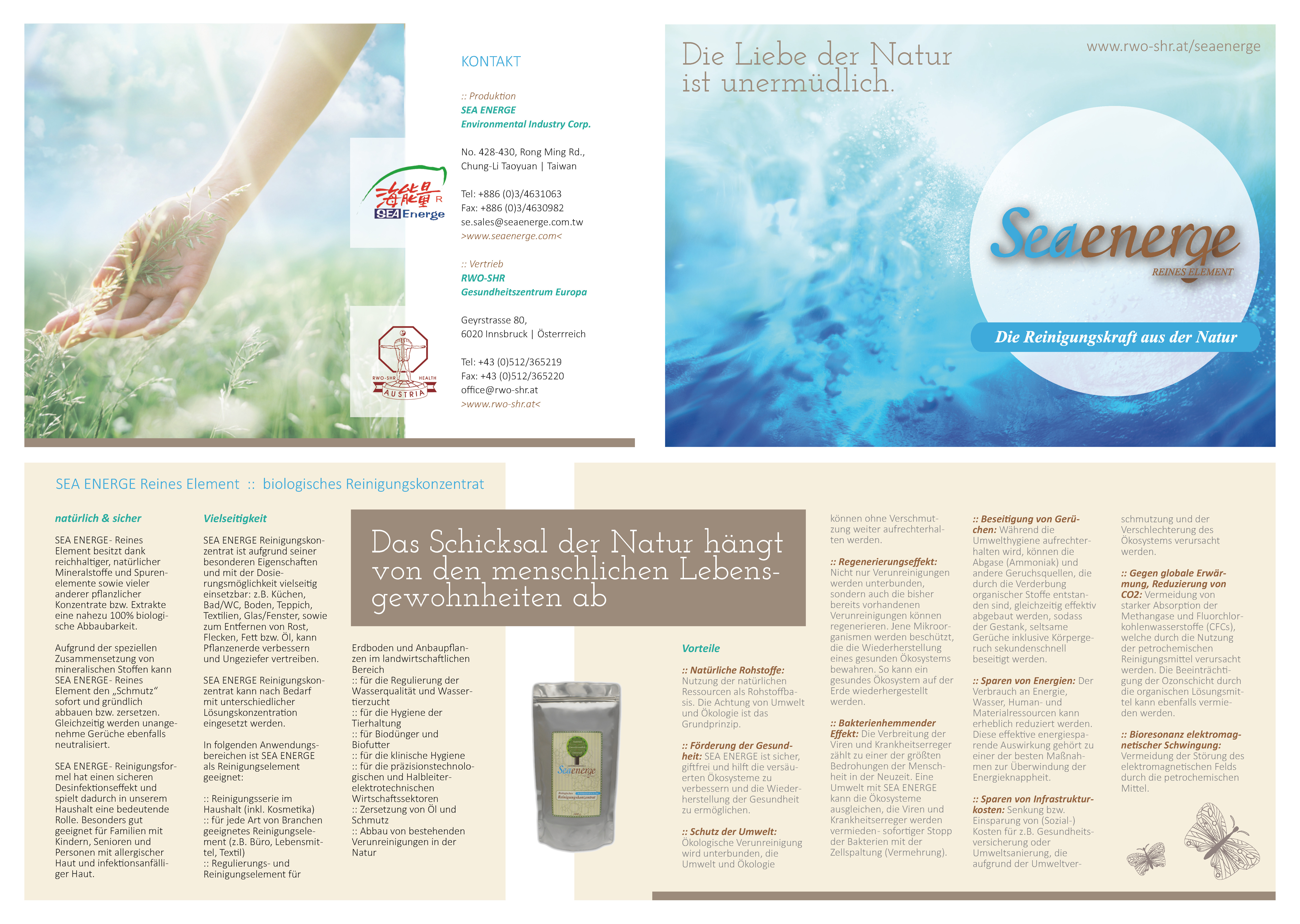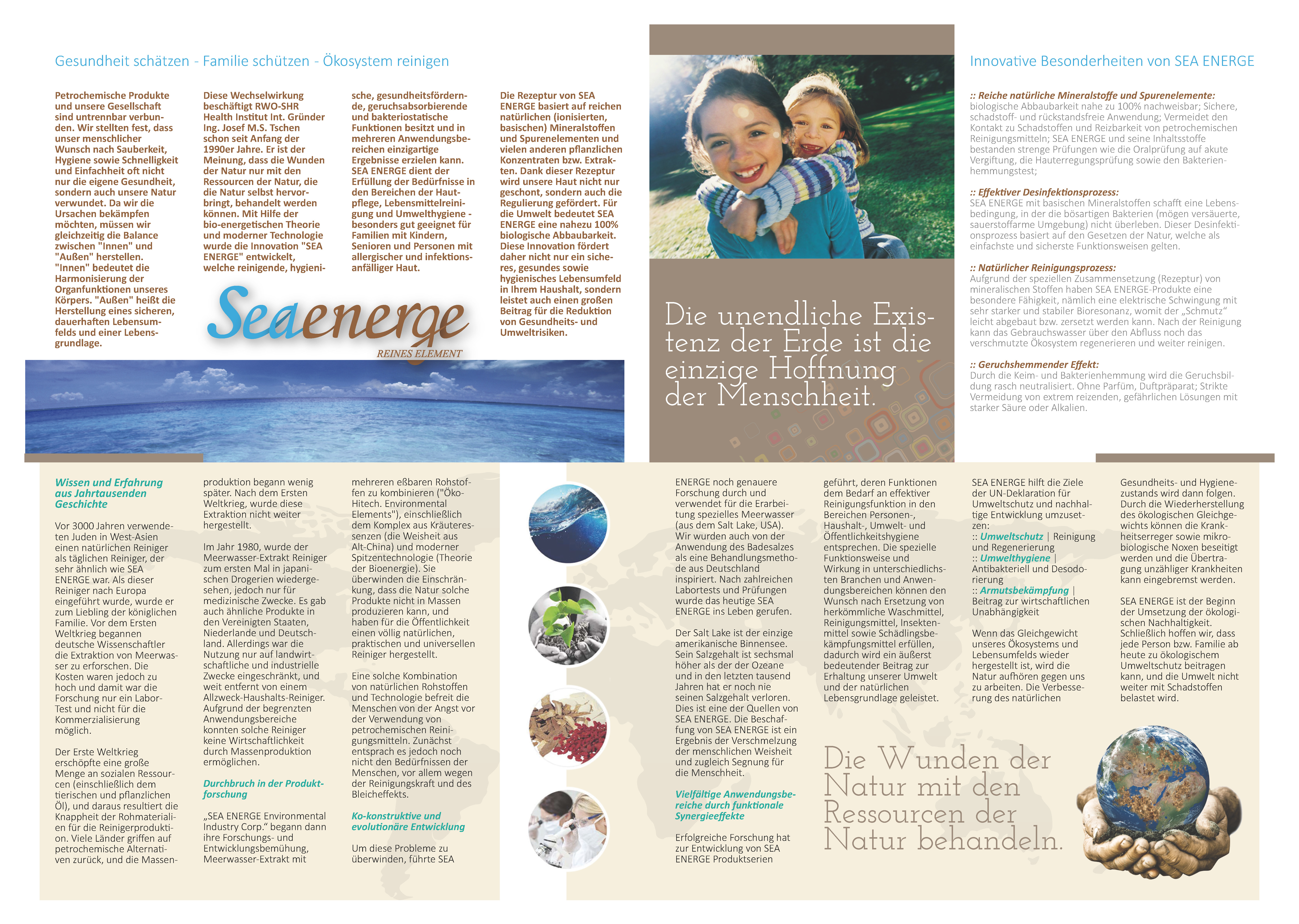 RWO-SHR Gesundheitszentrum Europa empfiehlt Ihnen die ökologische Reinigungs-produktserie von SEA ENERGE Environmental Industry Corp. (Taiwan) für Ihren Haushalt. SEA ENERGE Reinigungsproduktserie basieren auf reichen natürlichen Mineralstoffen, Spuren-elementen (z.B. aus Salt Lake/U.S.) sowie viele andere pflanzliche Konzentrate bzw. Extrakte. SEA ENERGE Reinigungsproduktserie fördern nicht nur ein sicheres, gesundes sowie hygienisches Lebensumfeld in Ihrem Haushalt, sondern leisten auch große Hilfe für die Reduktion von Gesundheits- und Umweltrisiken. >>> Besuchen Sie unsere SEA ENERGE Webseite